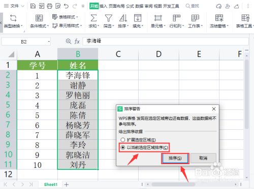 选择第二个【以当前选定区域排序】点击【排序】。