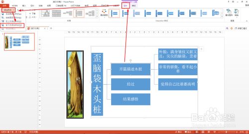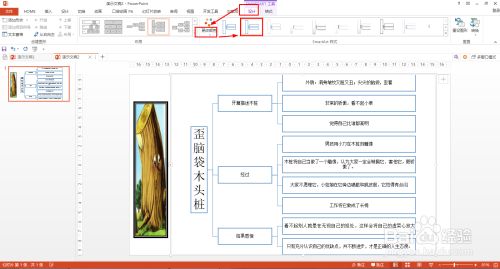 输入三个二级题目——选择“开篇描述木桩”分支题目——SMARTART东西——添加外形——鄙人方添加外形,添加三个下级分支描写木桩的表面和性格。