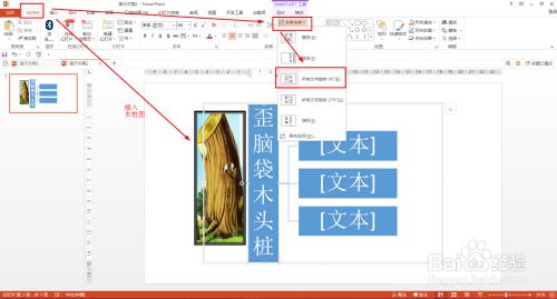 输入题目:歪脑壳木头桩——HOME——文字偏向——所有文字扭转90°,插入——图片——插入一个木桩图片在题目旁边。