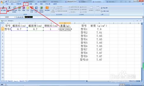 A1:E1别离输入以下题目:型号、截面长(cm)、截面宽(cm)、钢板长(cm)、重量(g)。A2:E2按照题目输入响应内容。