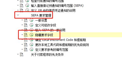 点击'财政管帐',睁开子项,选择'合同科目应收与应付账条目' —> '营业买卖' —> '付条目' —>'收条目/付条目建立' —> 'SEPA要求办理' —> '埋没要求字段' ,并点击执行