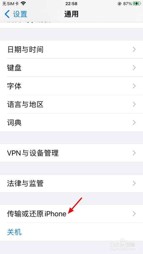 在通用页面,点击传输或还原iPhone。