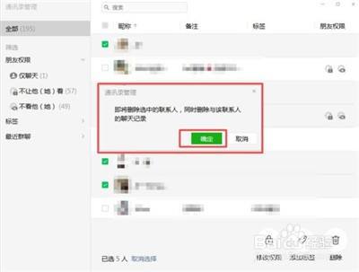 此时软件会弹出【即将删除选中的联系人】的提醒窗口,我们直接点击【确定】按钮,就可以批量删除微信老友了。