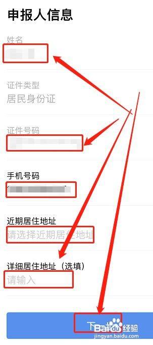输入相关的申报人姓名、证件号码、手机号码、栖身地址后,点击“下一步”。