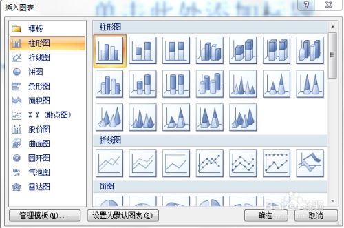 在弹出的插入图表的表格中找到柱形图,然后点击确定。