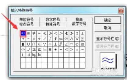 在该对话框内找到数学符号选项,并在其内找到约等于选项,如图所示: