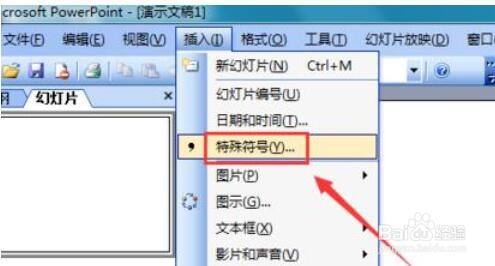 点击插入选项,在其子级菜单里找到特别符号选项,如图所示: