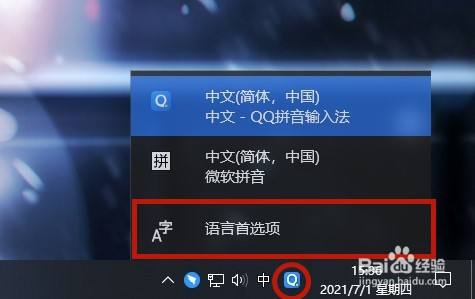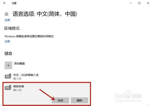 3、下拉找到常用的微软自带输入法,小编这里以微软拼音为例,单击“微软拼音”,点击“选项”。