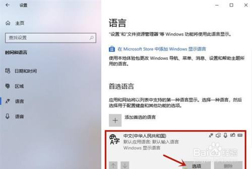 2、打开后在右侧找到“中文(中华人民共和国)”并单击,之后选择“选项”。