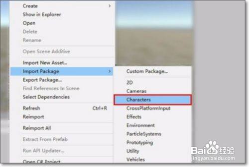 2、第二步在弹出的选项框中找到Import Package——Characters,即导入人物脚色包。