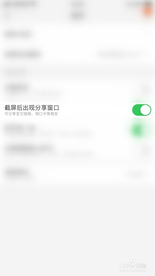 “截屏后呈现分享窗口”后面的圆点变为绿色即暗示淘宝开启截屏后呈现分享窗口当作功