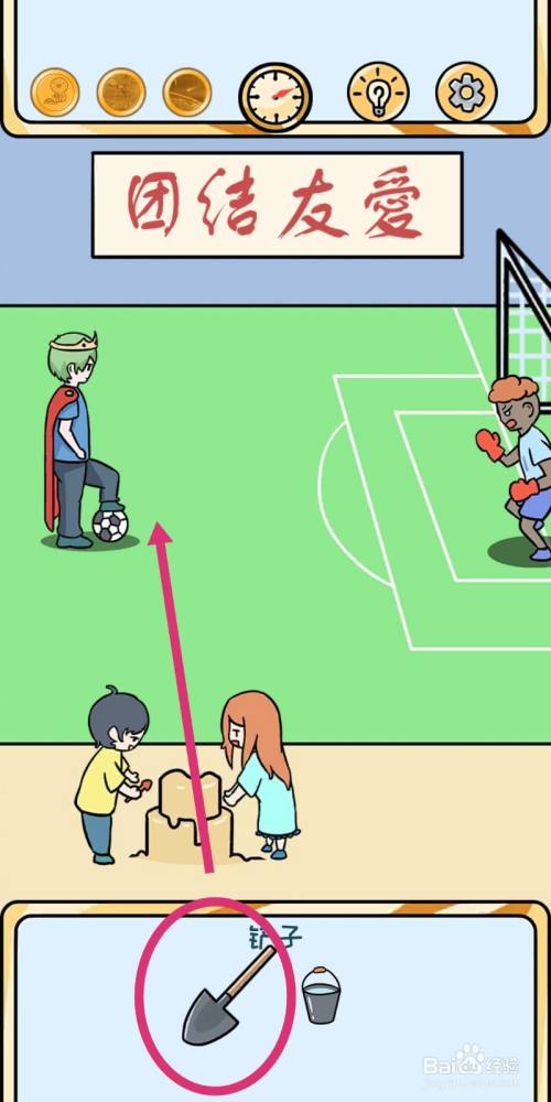 点击拖动【铲子】,去铲足球前方的土。