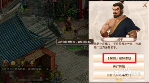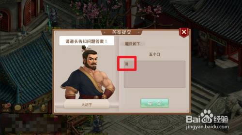 出官府对话大胡子,再次对话大胡子,选择破解难题 ,输入“田”