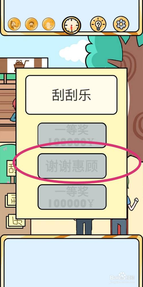 点击刮刮乐中的【感谢光顾】,游戏就过关了。