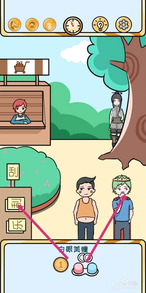 先拖动【白眼美瞳】给男本家儿角戴上,再用【金币】去买刮刮乐。