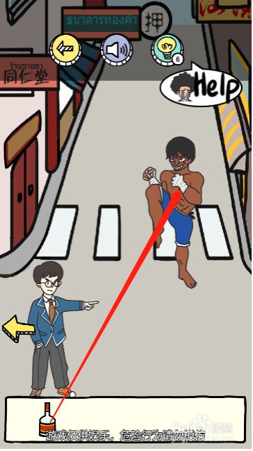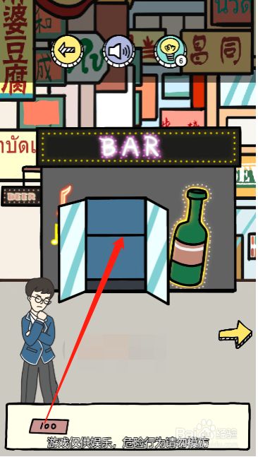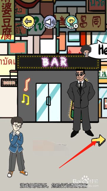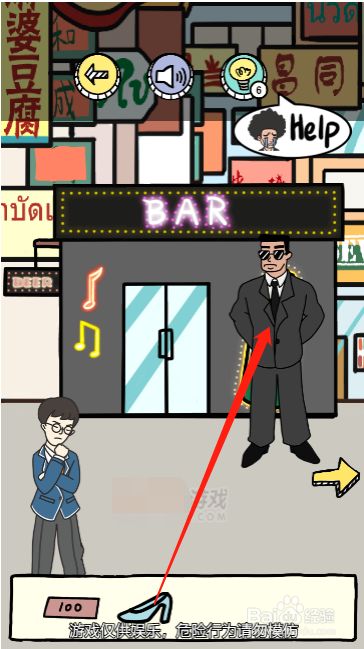 工具/原料小新13window10方式/步骤1首先点击右侧箭头按钮切换到右边的场景2之后拿到空中失落落下来的一百块钱3然后从美男那边拿到一只高跟鞋(实际中不成以随便拿别人工具哦)4随后回到左边的场景利用高跟鞋吸引开商铺门口的保镖5接着对商铺利用钞票以换取好酒6最后切换到最右边的场景利用烈酒灌晕坏人即可过关END