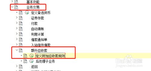 点击'财政管帐',在列表中找到‘界说附加应收条目法则’,点击执行