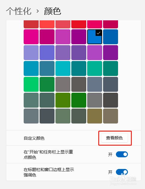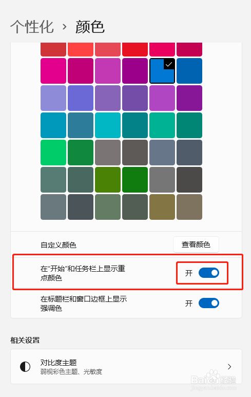 把颜色选择区域下方的“在“起头”和使命栏上显示重点颜色”开启