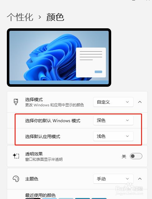 将“选择您的默认windows模式”选择为深色,“选择默认应用模式”选择为淡色