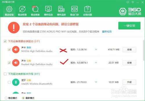 打开360驱动巨匠。发现2个声卡驱动。请装打√的。这个是公版驱动。上面那个是显卡厂家做的,可以无视。别的,要注重的是这个驱动也只有22M,良多玩家觉得装完就当作功了,其实这个驱动并没有供给高清音频办理东西。可是当您安装后,360驱动会刷新出那个300M的官方完整驱动“audio_realtek_6.0.8899.1_w71064”。安装过程一样,大师自行进级这个300M的公版驱动。