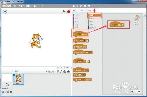 用鼠标点击事务面板,添加当绿旗被点击号令;