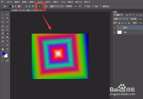 我们在属性栏选择【中间渐变】,在画布上按住鼠标左键进行拖沓,如下图,就获得了中间渐变结果。