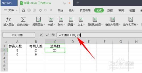 输入完当作后,鼠标单击C2单位格,在输入栏中输入“=COMBIN(8,2)”。