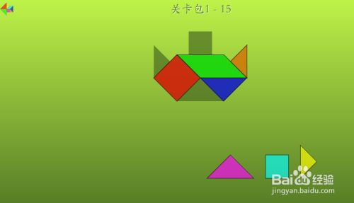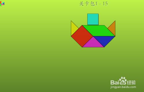 最后绿色平行四边形拼块的上面,放上天蓝色正方形拼块挨着,如图,这样就通关了。