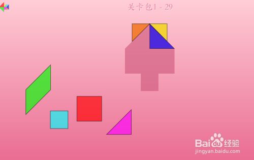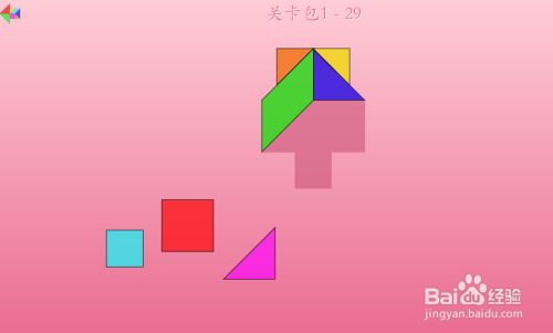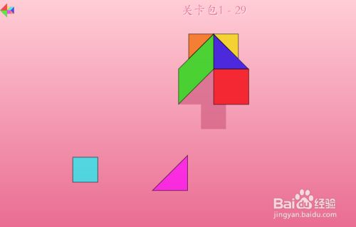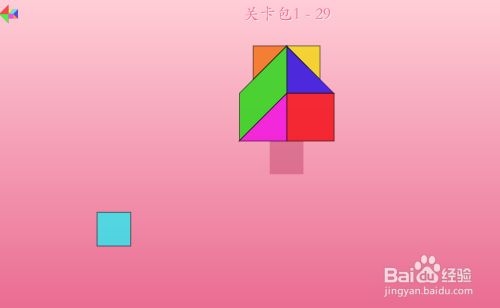 最后在粉红三角形拼块的下面,放上天蓝色正方形拼块挨着,如图,这样就通关了。