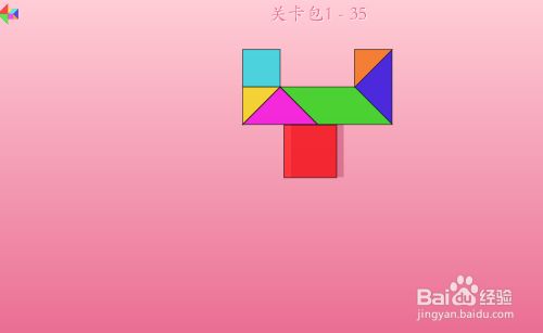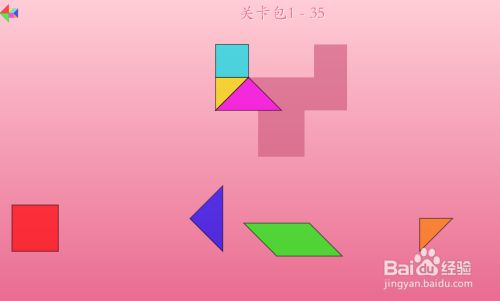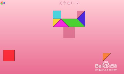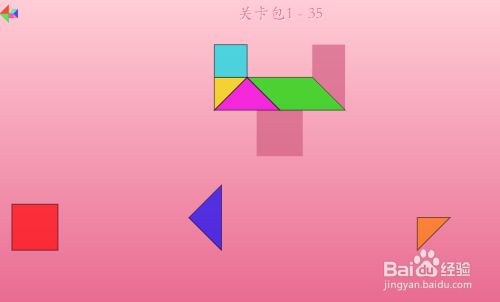 最后在绿色平行四边形拼块的下面,放上红色正方形拼块挨着,如图,这样就通关了。