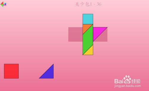 最后在绿色平行四边形拼块的左侧,放上红色正方形拼块挨着,如图,这样就通关了。