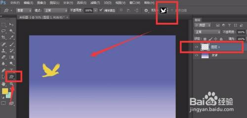 在布景上新建一个图层,点击自界说外形东西,选择小鸟样式进行绘制