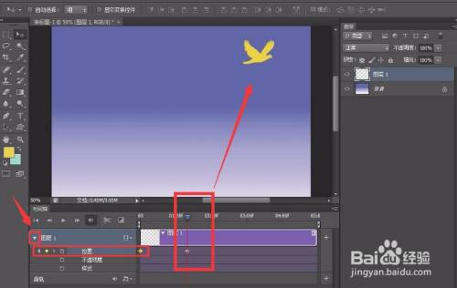 打开图层倒三角按钮,找到位置选项,固定初始位置后,移动小鸟并标识表记标帜时候点位置