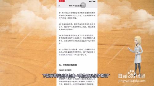 进入“软件许可及办事和谈”后,下滑屏幕找到并点击“微信隐私庇护指引”。
