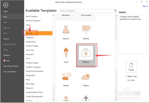 1、打开Edraw Max ,在剪切画中双击医疗;