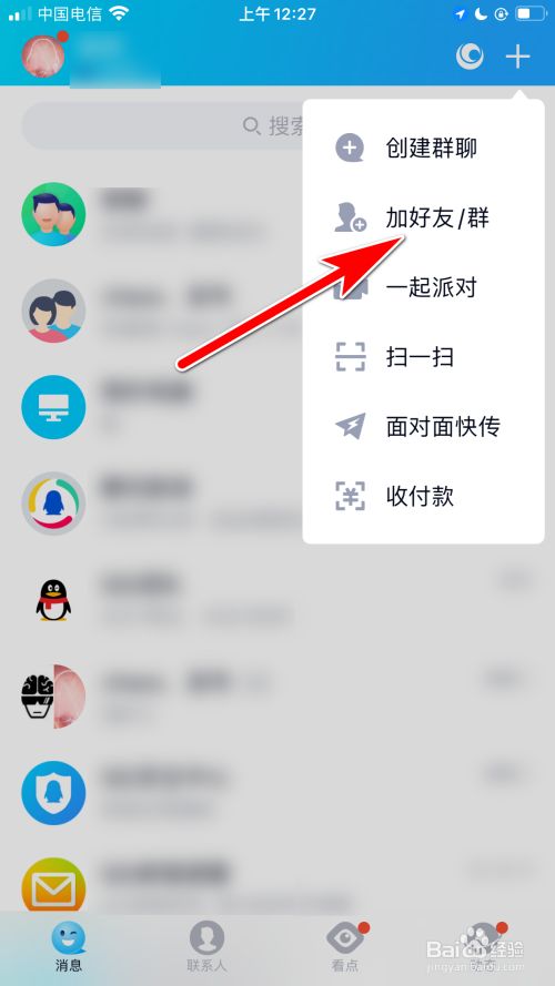 在QQ的本家儿栏目中睁开右上角加号的平台。