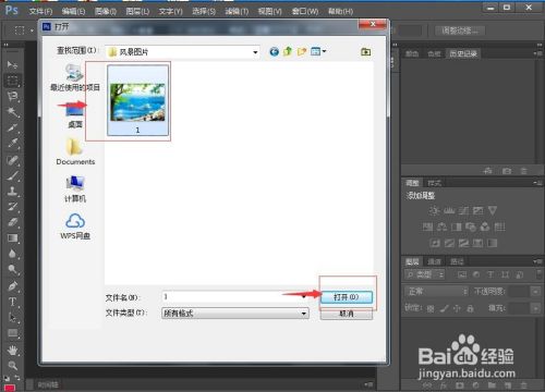 找到并选中需要处置的风光图片,按打开;