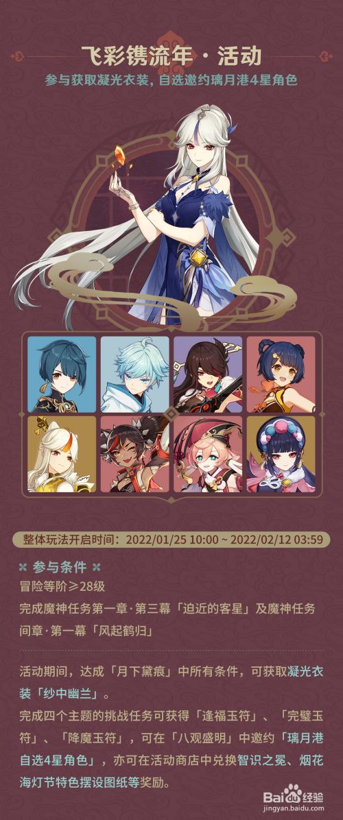 下一个就是“飞彩携流年”活动,要求冒险等阶大于28级,还要完陈规定的使命章节,达到“月下黛痕”所有前提,就可以获取凝光的衣装。
