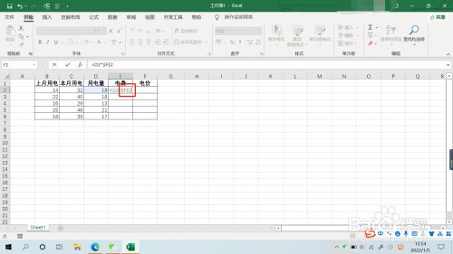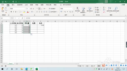 先来计较用电量,本月用电减去上月用电:=C2-B2