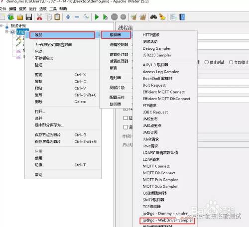 添加线程组后,点击线程组后鼠标右键,依次选择取样器->jp@gc - WebDriver Sampler
