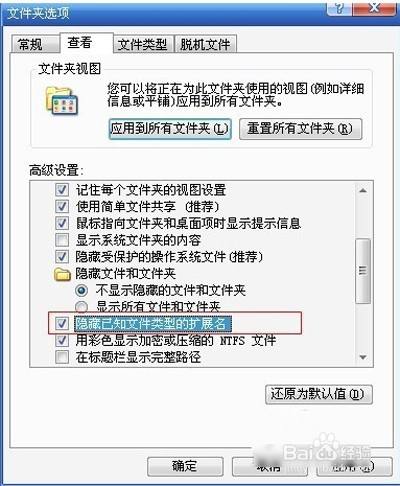6、将此选项勾拔取消失落就可以了,这样文件类型的扩展名就会展示出来了。