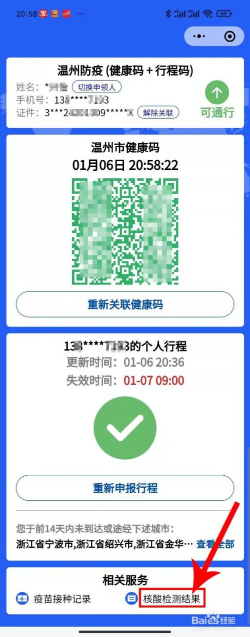 然后,在温州防疫码页面底部,选择红色箭头方框处,点击“核酸监测成果”按钮。【下方如图所示】
