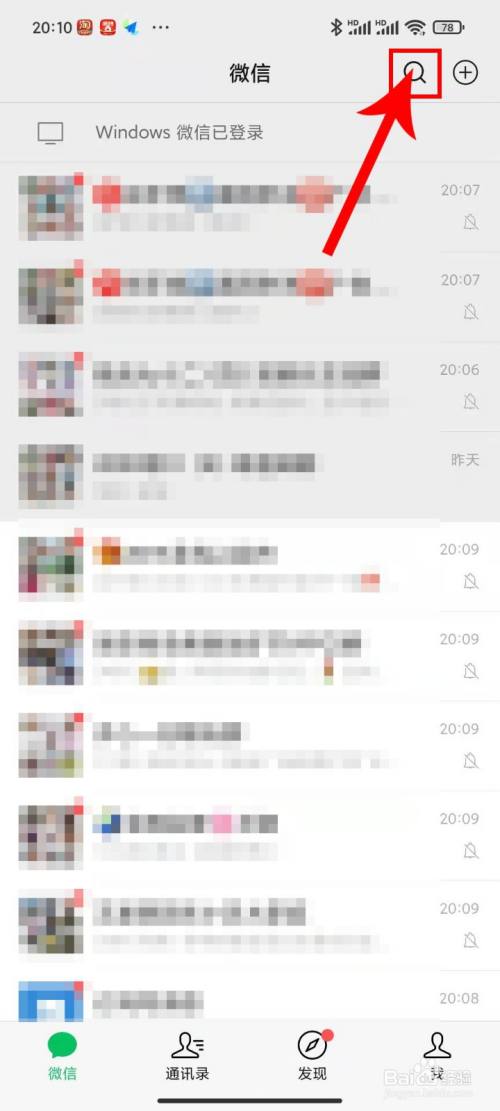 首先我们打开微信后,在页面右上方点击红色箭头方框处的“放大镜”按钮。【下方如图所示】