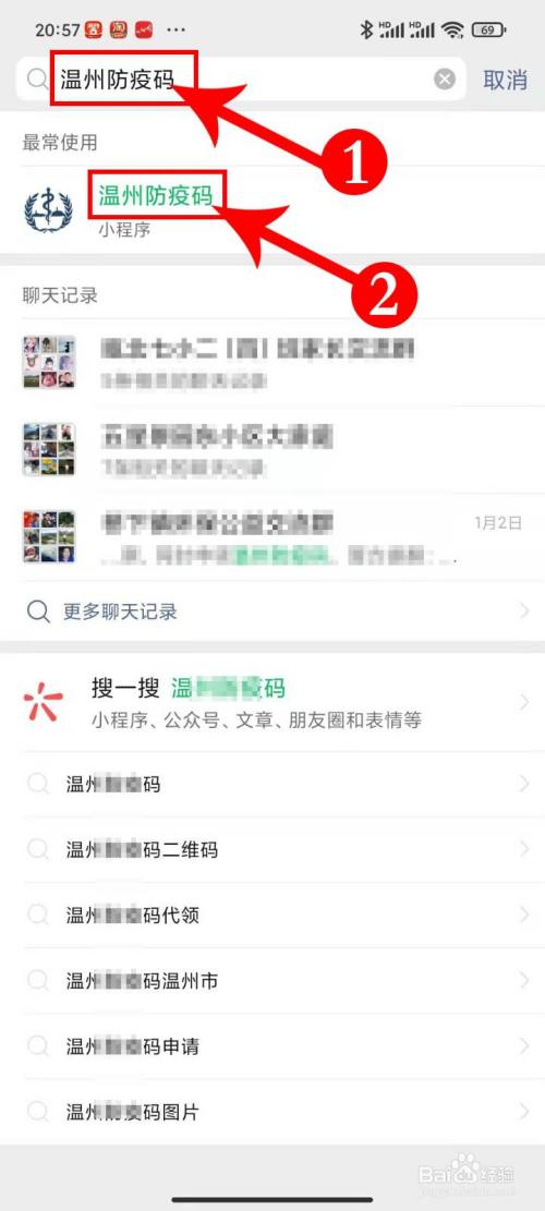 在顶部搜刮栏中,在标识表记标帜➊的红色箭头方框处,输入“温州防疫码”五个字符,在页面➋处,点击“温州防疫码”按钮。【下方如图所示】