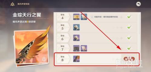 在【声望】中选择品级8级奖励领取。这时,我们可获得【金琮天行之翼】。