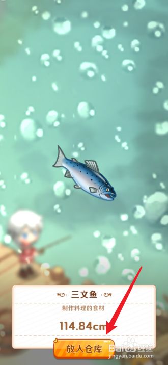 当作功钓到一条三文鱼,点击【放入仓库】。