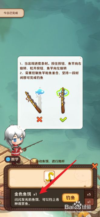 利用【金色鱼饵】,点击【垂钓】,会钓到更多种类的鱼。