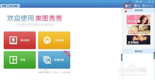 第一步:在美图秀秀软件本家儿界面中,单击右上方“打开”按钮。