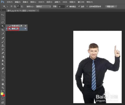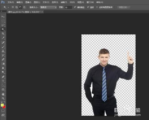 第三步:在左侧东西栏中,选择“魔棒东西”,单击鼠标左键选中图片中的布景区域。
