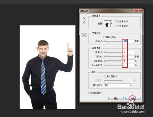 第七步:在弹出的“调整边缘”对话框中,按照现实环境,调节半径、光滑等参数至合适的水平,单击“确定”按钮。